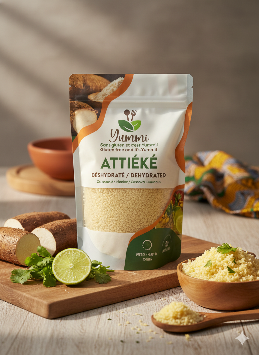 Notre attiéké est déshydraté et se conserve jusqu’à 3 ans pour éviter le gaspillage alimentaire, de préserver toute la saveur… et d’avoir toujours un attiéké frais et prêt à cuisiner sous la main 💛